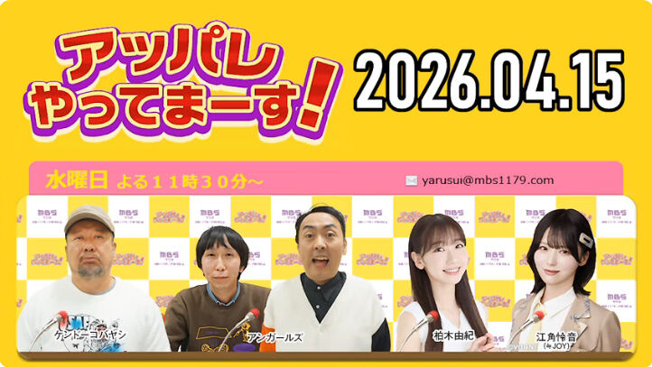 【動画】2026.04.08 アッパレやってまーす!水曜日 【江角怜音 (≒JOY)、ケンドーコバヤシ、アンガールズ、柏木由紀】 2026年04月09日 カテゴリ:ラジオ=LOVE(イコールラブ) mixiチェック 【【動画】2026.04.08 アッパレやってまーす!水曜日 【江角怜音 (≒JOY)、ケンドーコバヤシ、アンガールズ、柏木由紀】】の続きを読む タグ :#イコールラブ