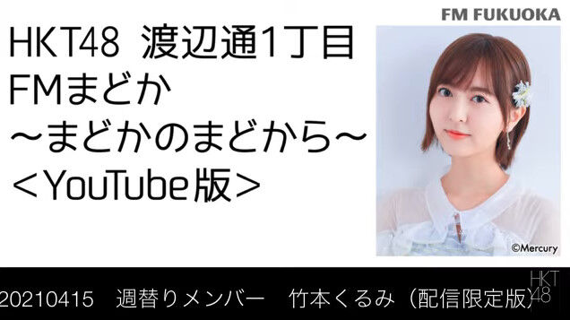 【動画】FM福岡「HKT48 渡辺通1丁目 FMまどか まどかのまどから YouTube版」週替りメンバー : 竹本くるみ(配信限定版)(2021/4/15放送分)/ HKT48[公式] 2021年04月15日 カテゴリ:ラジオ mixiチェック 【【動画】FM福岡「HKT48 渡辺通1丁目 FMまどか まどかのまどから YouTube版」週替りメンバー : 竹本くるみ(配信限定版)(2021/4/15放送分)/ HKT48[公式]】の続きを読む タグ :#HKT48#FMまどか#森保まどか#竹本くるみ
